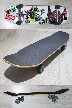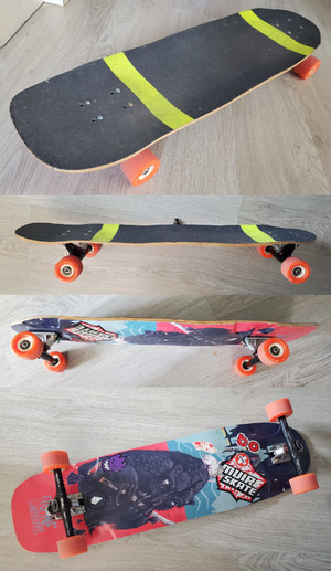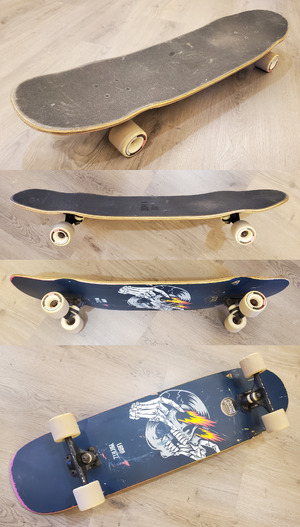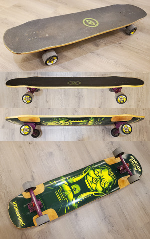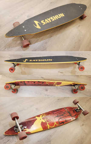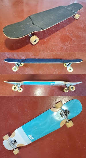 ![zoom [+]](THUMB_moonwalk41.jpg) 41"x9"x24.5-25.5"WB, 7-ply maple, currently @25.5"WB on Randal II 50° trucks and 64mm/80a Bustin Five-O wheels |