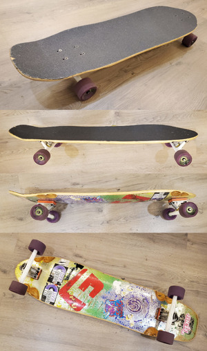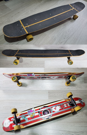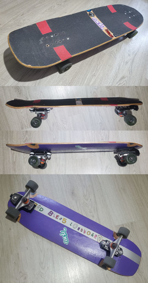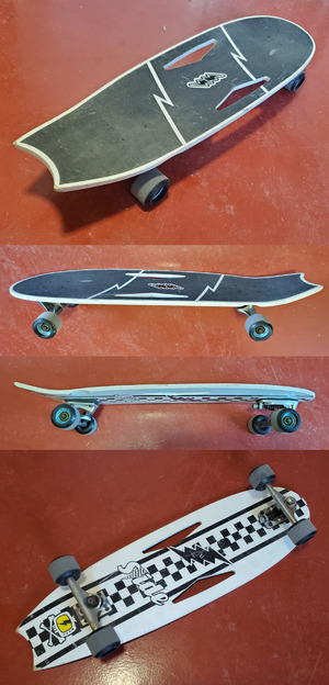 ![zoom [+]](THUMB_surfskate36.jpg) Repurposed Miller Speedway deck, 36"x9.75"x20.25-24.5"WB, 8-ply maple (thinned down to 7 under the platform), currently @20.5"WB w/Sabre TKP 180mm trucks on Waterborne clone adapters, 70mm F3(~83a) Matter (PowerSlide) wheels, down to 61mm avg |