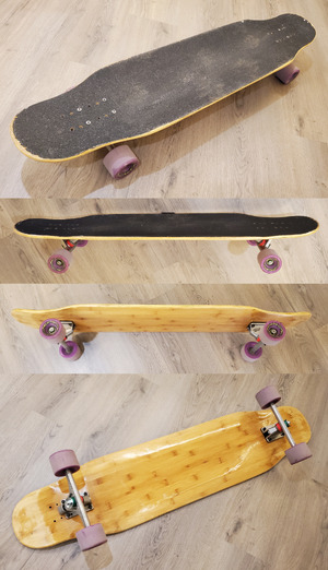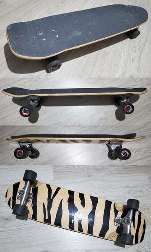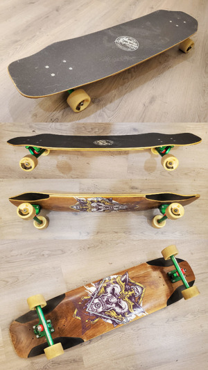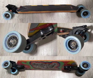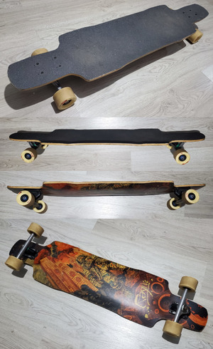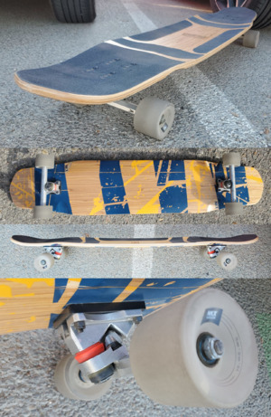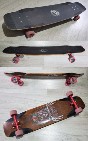 ![zoom [+]](THUMB_makalidk38.jpg) 38"x9.5"x20-26"WB, 7-ply maple/bamboo/walnut + fiberglass, currently @24"WB on Caliber 44 trucks (≈47° real angle due to rocker), 70mm/80a Remember Hoots wheels |